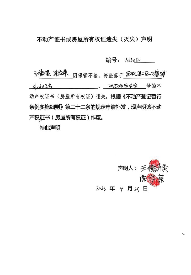 王德祿、陳改榮不動產(chǎn)證書或房屋所有權(quán)證遺失(滅失)聲明,編號:20250121
