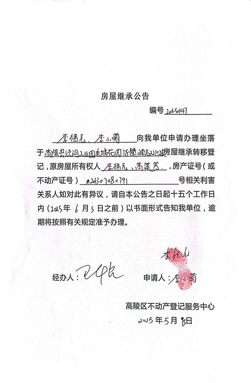 李福元、李小菊房屋繼承公告,編號:20250147