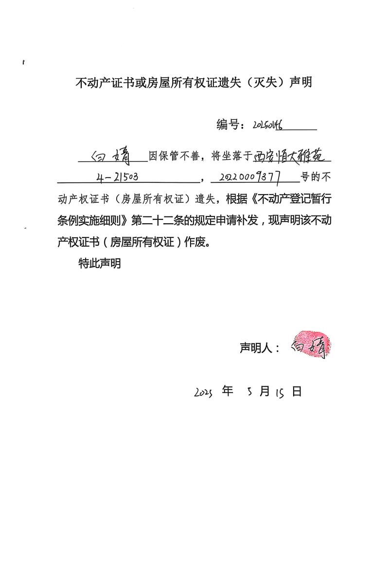 白婧不動產證書或房屋所有權證遺失(滅失)聲明,編號:20250146