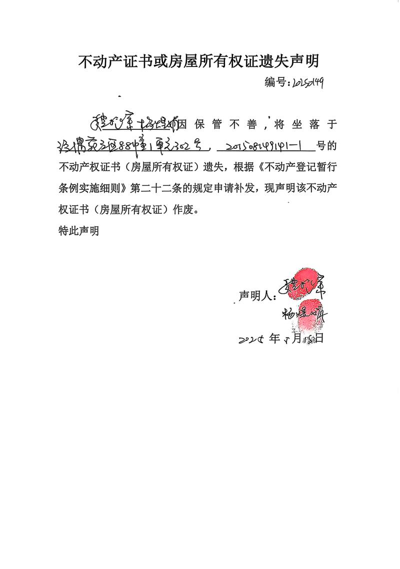 魏振榮、楊煜娟不動(dòng)產(chǎn)證書(shū)或房屋所有權(quán)證遺失聲明,編號(hào):20250149