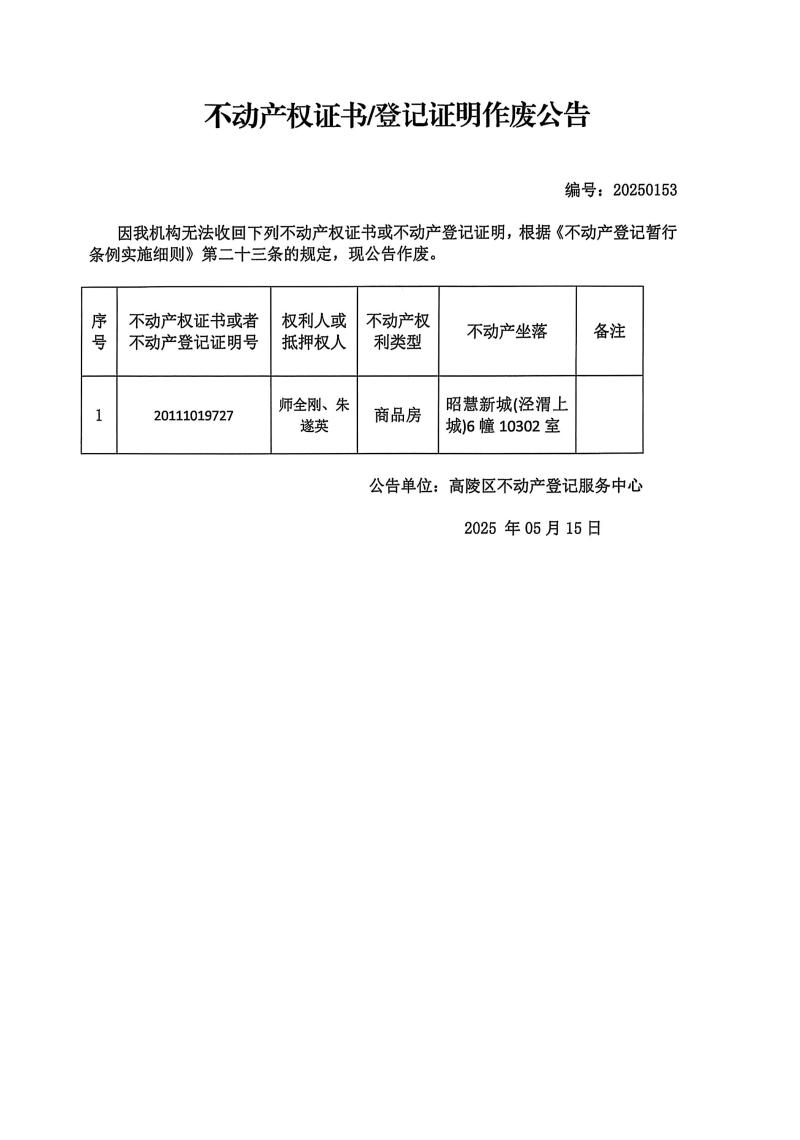 帥全剛、朱遂英不動產權證書/登記證明作廢公告,編號:20250153