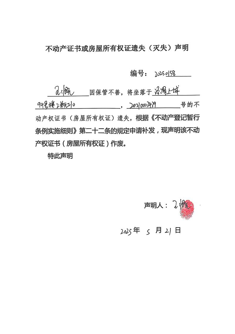 王慨不動(dòng)產(chǎn)證書或房屋所有權(quán)證遺失(滅失)聲明,編號(hào):20250158