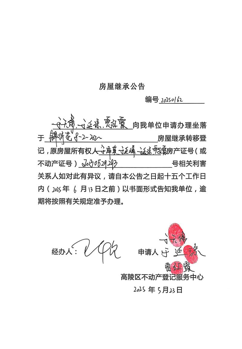 于天保、于延瓊、賈紅霞房屋繼承公告,編號:20250162