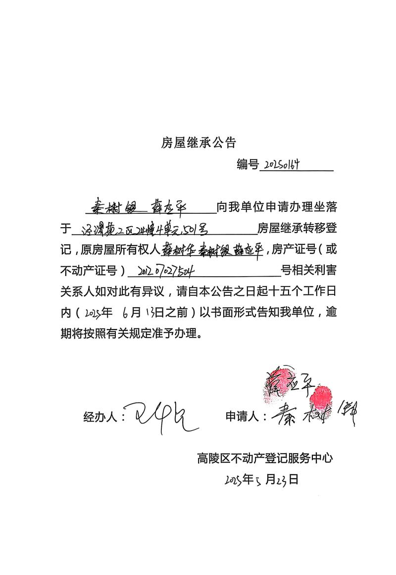 秦樹銀、薛應平房屋繼承公告,編號:20250164