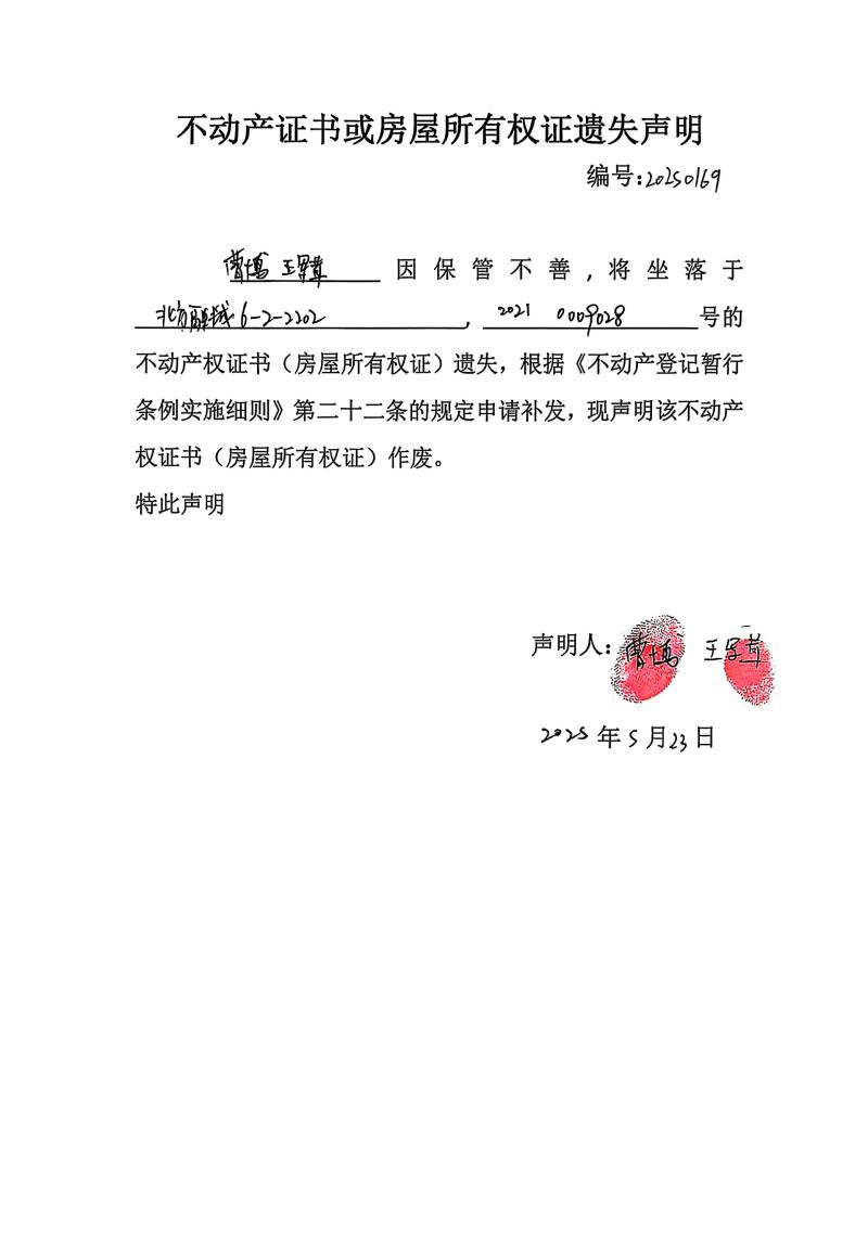 曹博、王軍茸不動(dòng)產(chǎn)證書或房屋所有權(quán)證遺失聲明,編號(hào):20250169