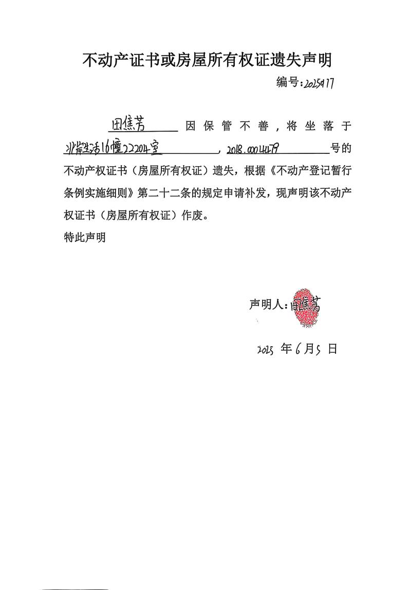田焦芳不動(dòng)產(chǎn)證書或房屋所有權(quán)證遺失聲明,編號(hào):20250177