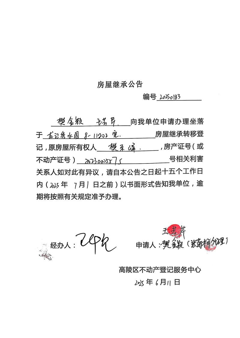 樊金穎、王芳芹房屋繼承公告,編號:20250183
