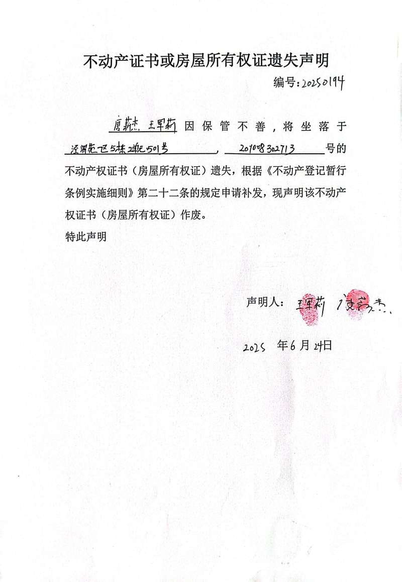 唐薪杰、王軍莉不動產證書或房屋所有權證遺失聲明,編號:20250194