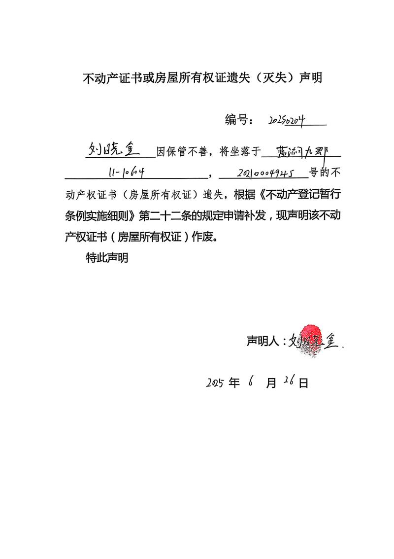劉曉金不動產證書或房屋所有權證遺失(滅失)聲明,編號:20250204