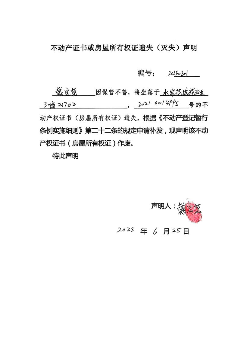戴寶瑩不動(dòng)產(chǎn)證書(shū)或房屋所有權(quán)證遺失(滅失)聲明,編號(hào):20250201