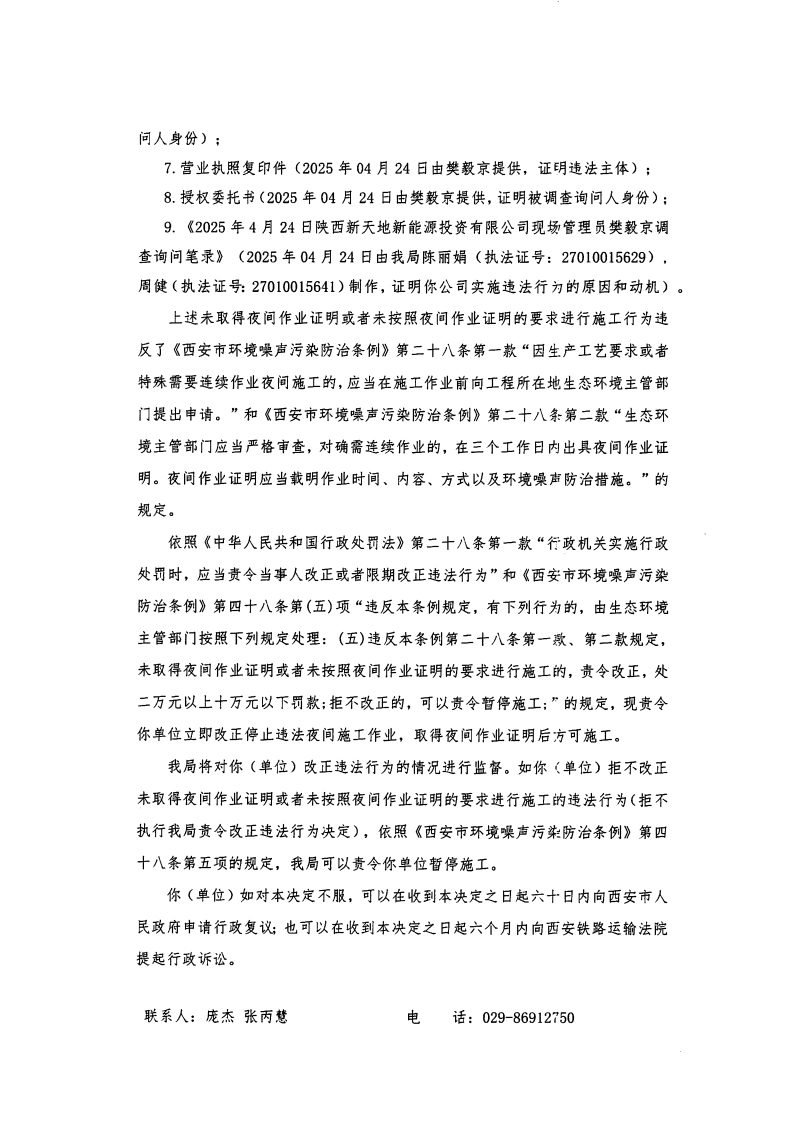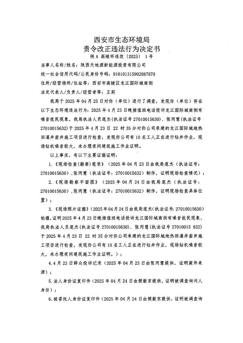 西安市生態環境局責令改正違法行為決定書陜A高陵環違改〔2025〕1號