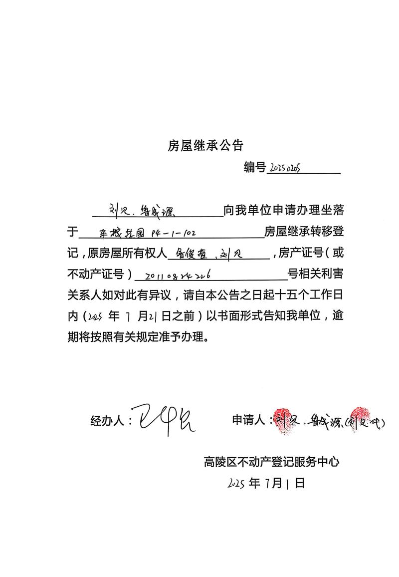 劉貝、魯成源房屋繼承公告,編號:20250205