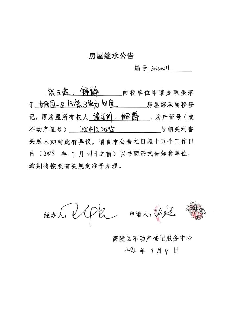 談玉蓮、解靜房屋繼承公告,編號:20250211