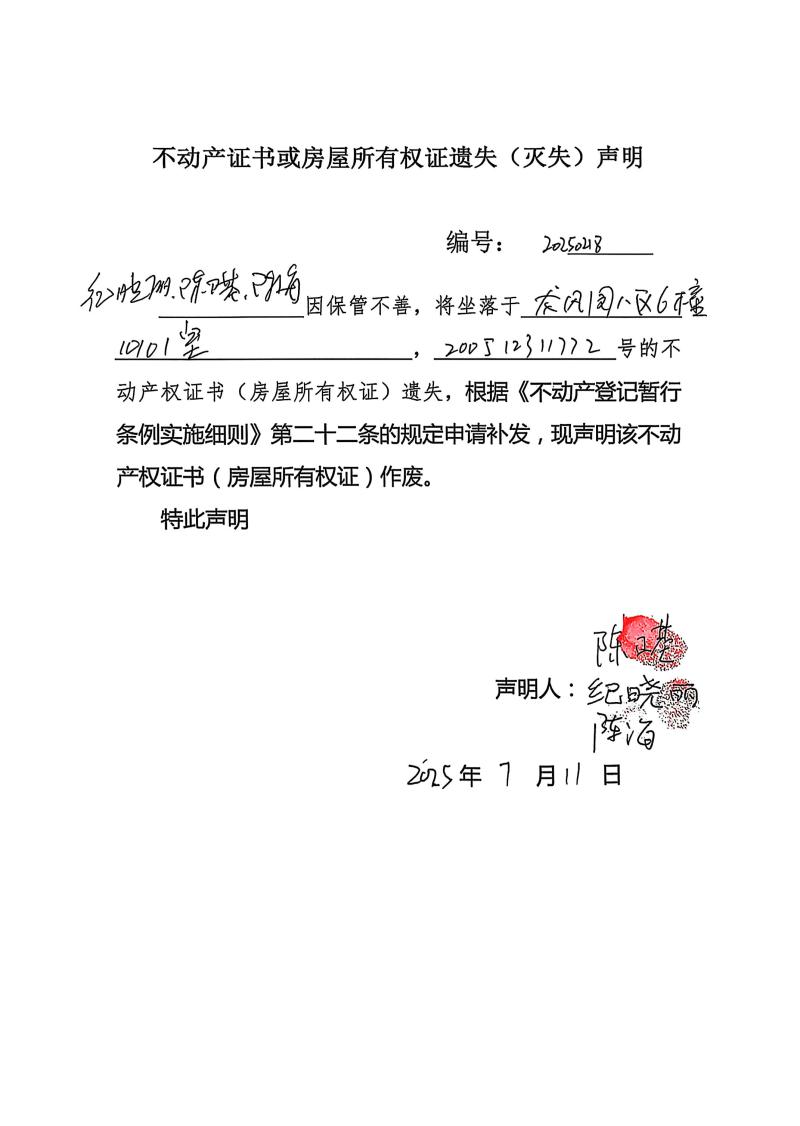 紀曉麗、陳海、陳衛基不動產證書或房屋所有權證遺失(滅失)聲明,編號:20250218