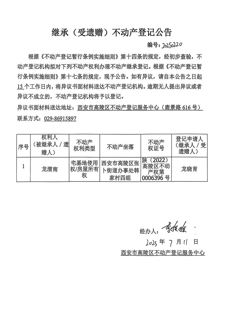 龍曉育繼承(受遺贈)不動產(chǎn)登記公告,編號:20250220