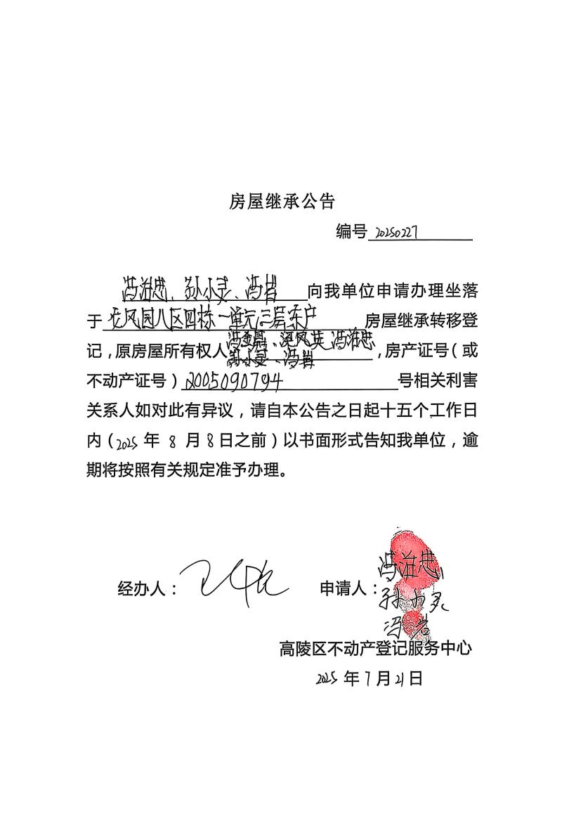 馮治忠、孫小靈、馮巖房屋繼承公告,編號(hào):20250227