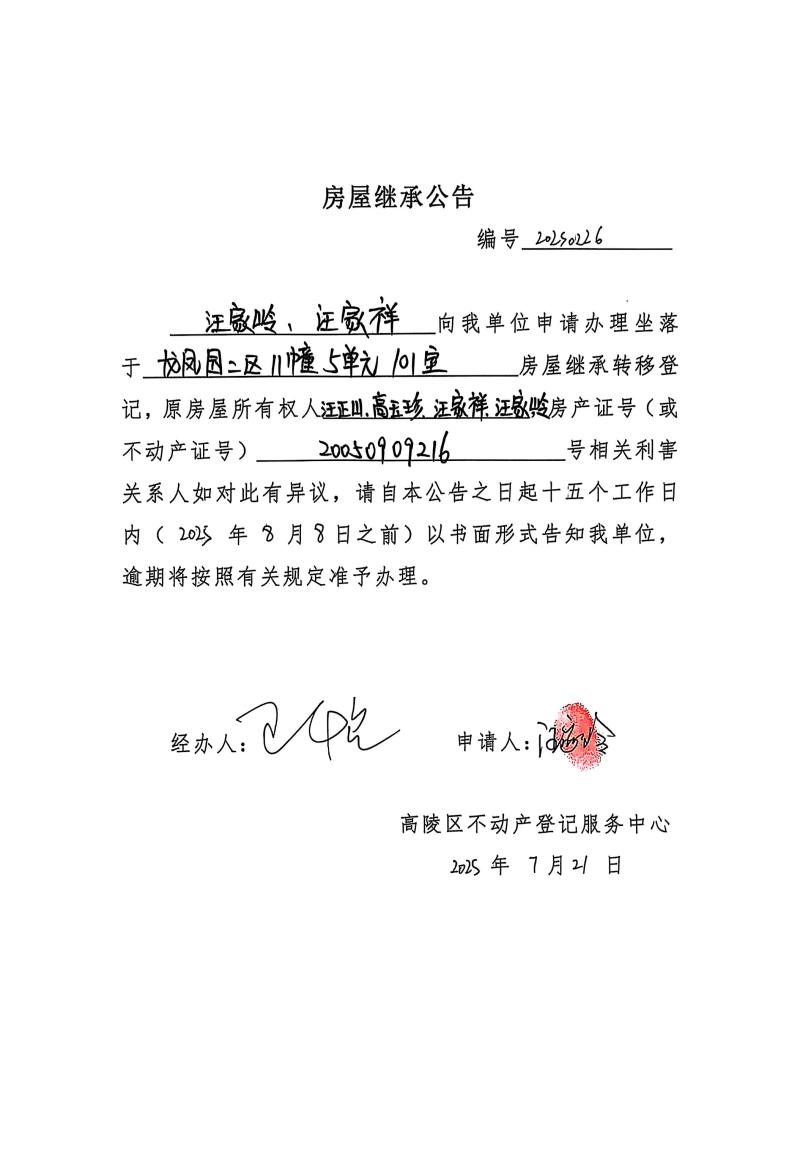 汪家嶺、汪家祥房屋繼承公告,編號:20250226