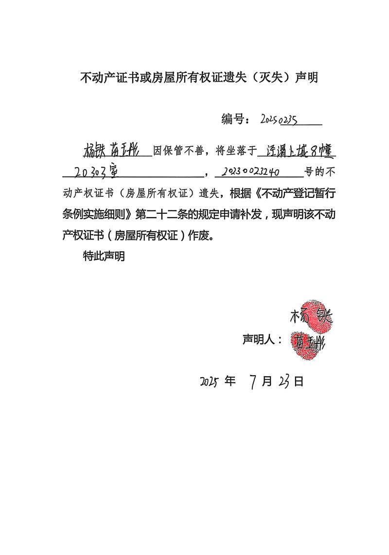 楊鐵、苗玉彤不動產(chǎn)證書或房屋所有權(quán)證遺失(滅失)聲明,編號:20250235