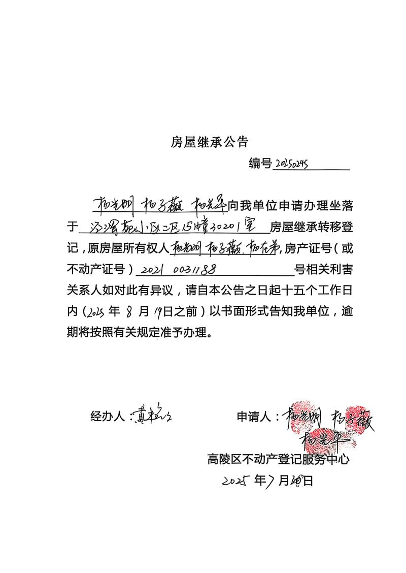 楊光明、楊子微、楊光平房屋繼承公告,編號:20250245