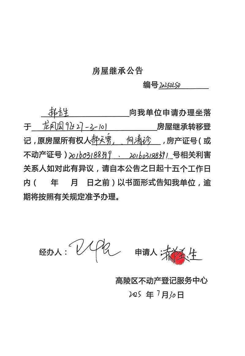 郝玉生房屋繼承公告,編號:20250250