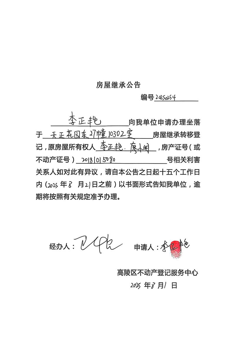 李正艷房屋繼承公告,編號:20250254