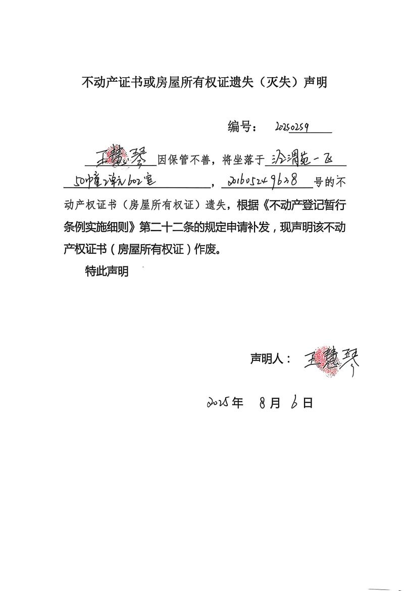 王慧琴不動產證書或房屋所有權證遺失(滅失)聲明,編號:20250259