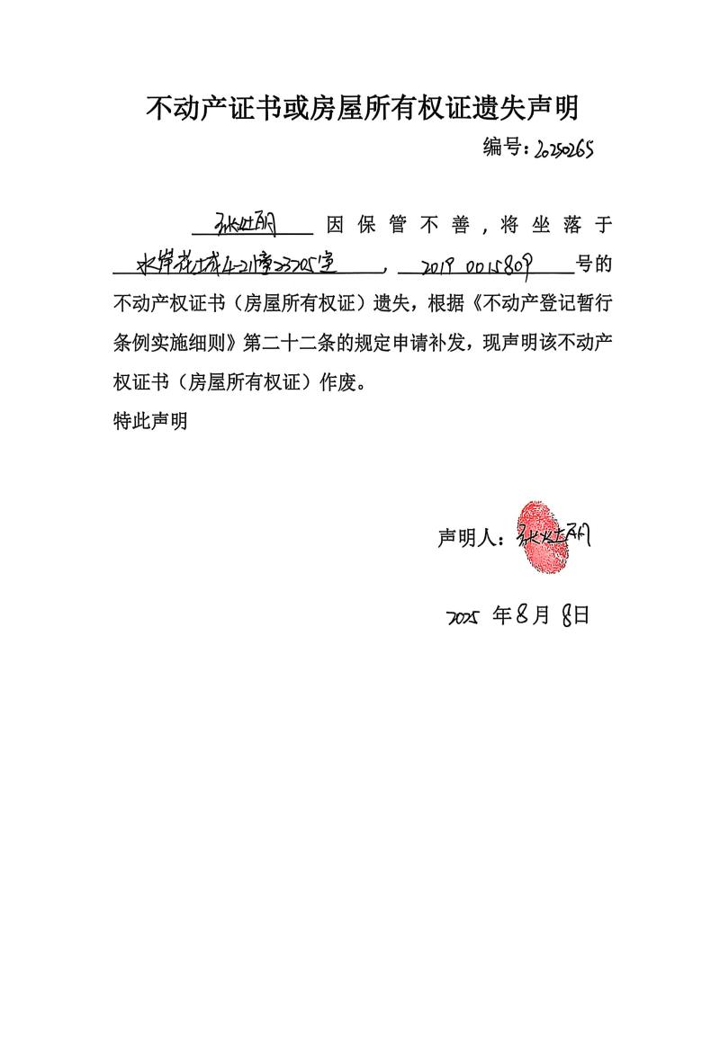 張灶麗不動產(chǎn)證書或房屋所有權(quán)證遺失聲明,編號:20250265