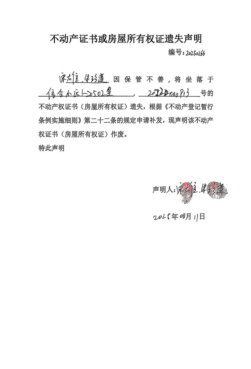 宋雄、朱珍蓮不動(dòng)產(chǎn)證書(shū)或房屋所有權(quán)證遺失聲明,編號(hào):20250266