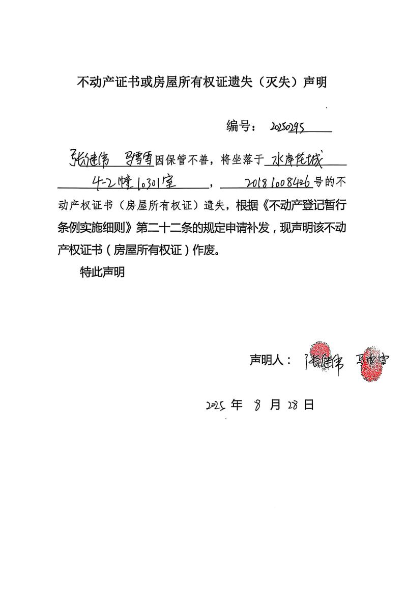 張繼偉、馬雪雪不動產證書或房屋所有權證遺失(滅失)聲明,編號:20250295
