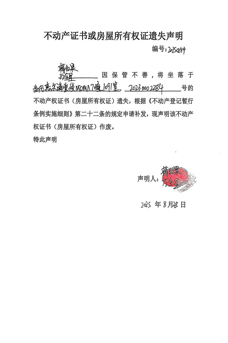蔣紅果、萬(wàn)全星不動(dòng)產(chǎn)證書(shū)或房屋所有權(quán)證遺失聲明,編號(hào):20250294