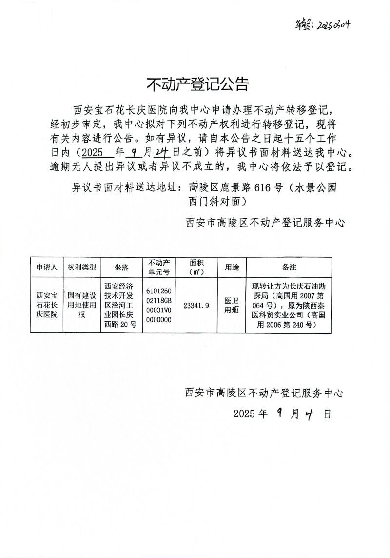 西安寶石花長慶醫(yī)院不動產登記公告,編號:20250304