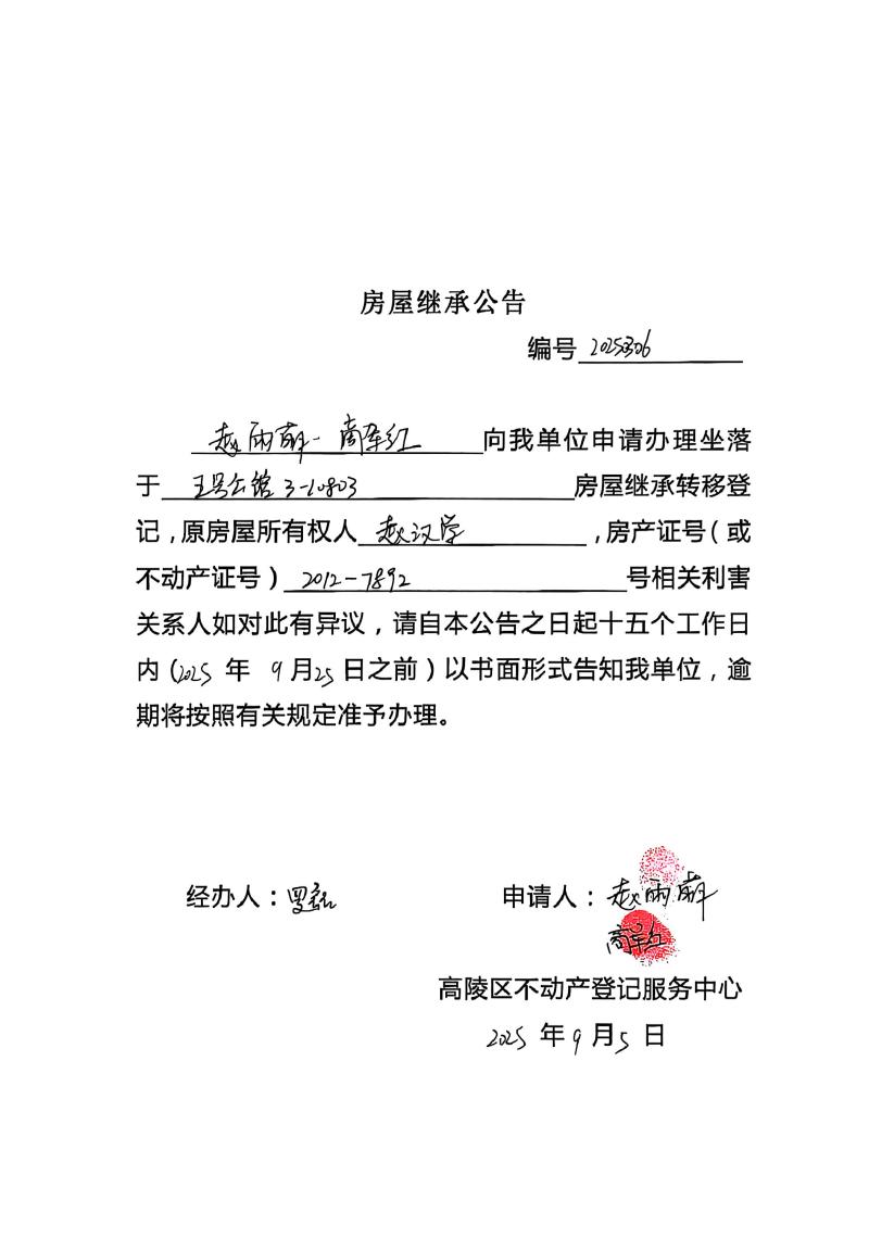 趙雨萌、商軍紅房屋繼承公告,編號:20250306