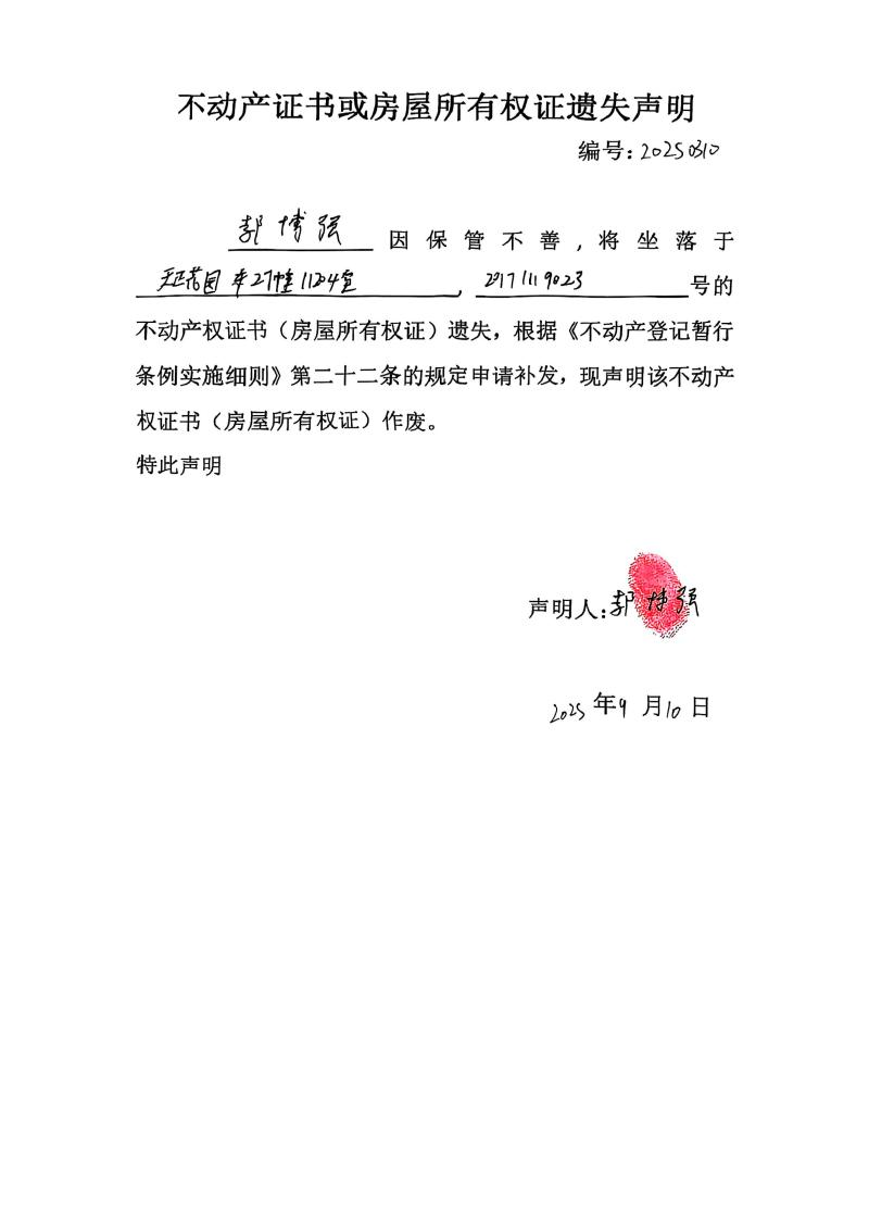 郝博強不動產證書或房屋所有權證遺失聲明,編號:20250310