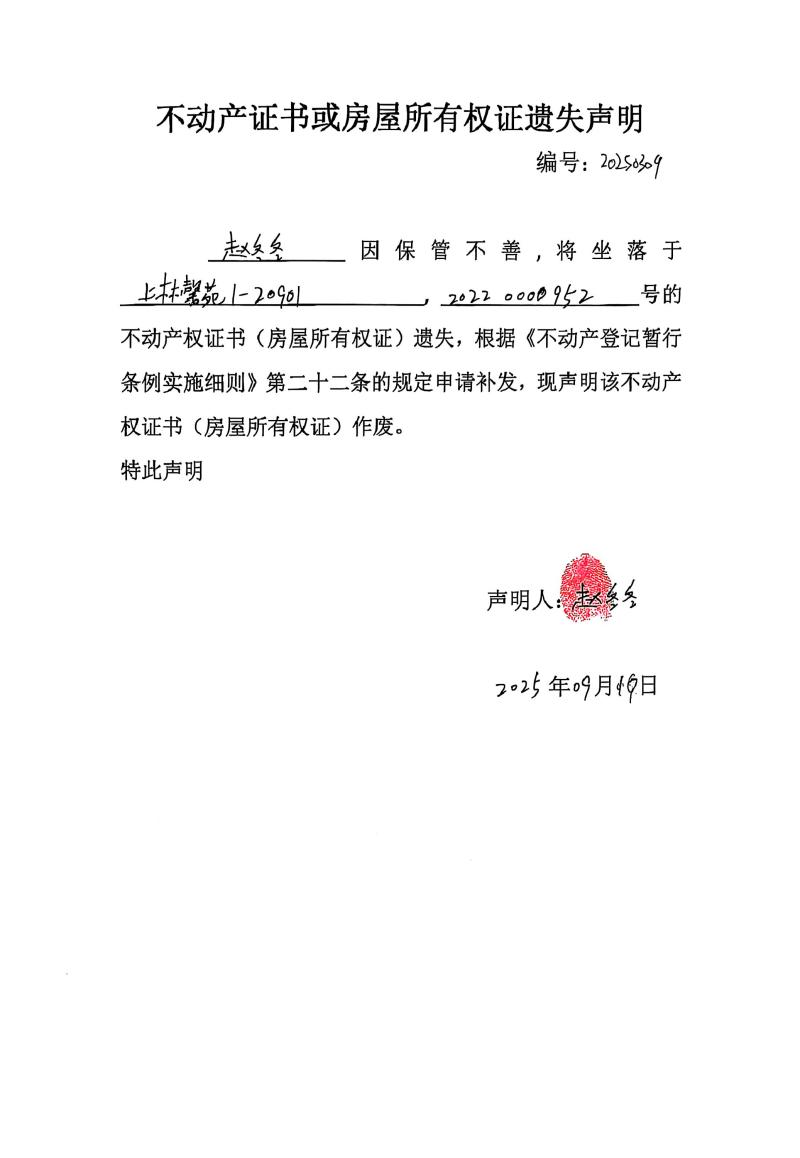 趙冬冬不動產證書或房屋所有權證遺失聲明,編號:20250309