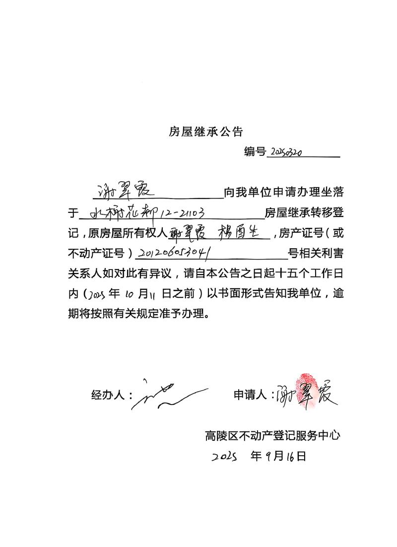 謝翠霞房屋繼承公告,編號(hào):20250320