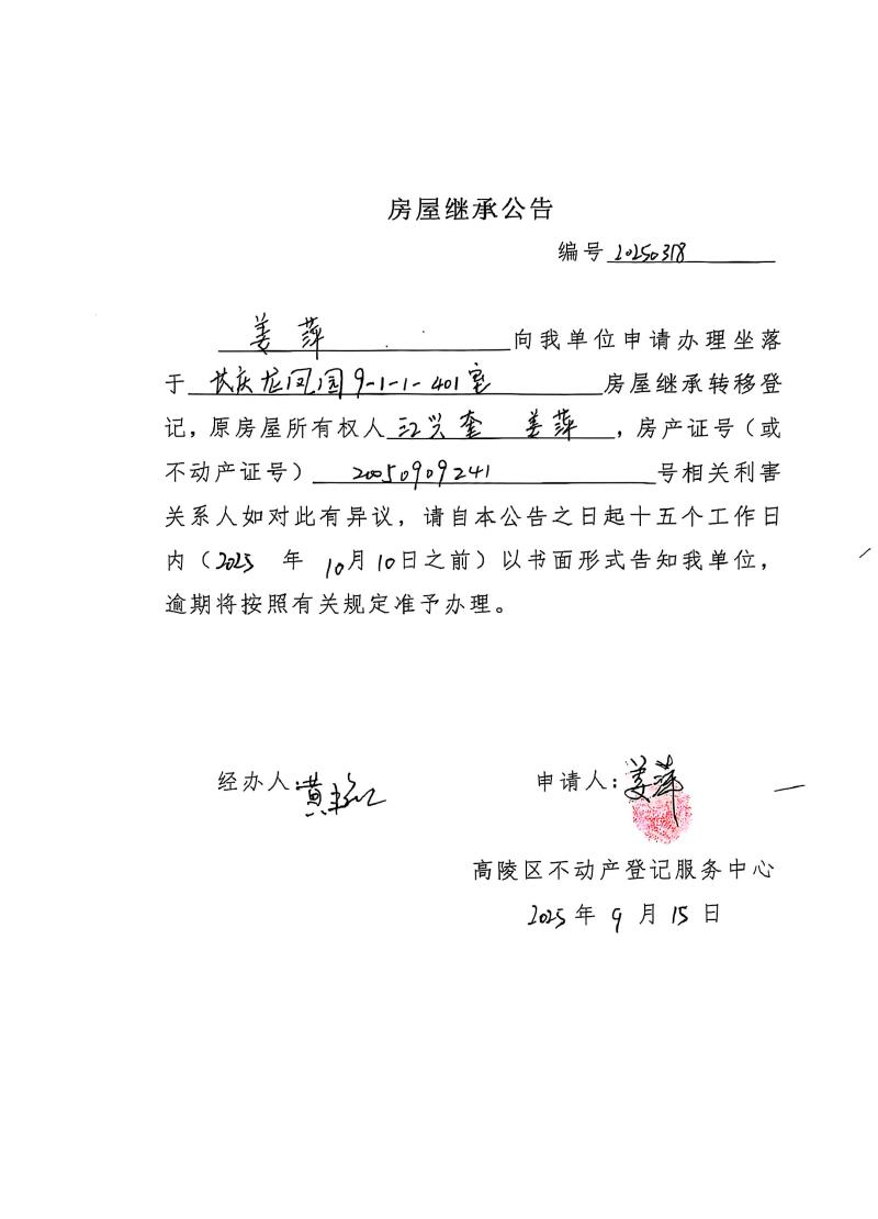姜萍房屋繼承公告,編號:20250318