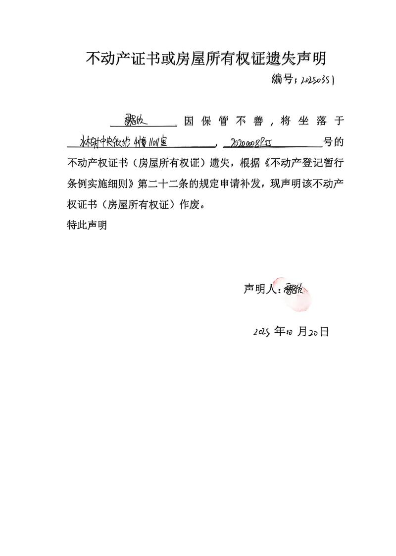 魏欣不動產(chǎn)證書或房屋所有權(quán)證遺失聲明,編號:20250351