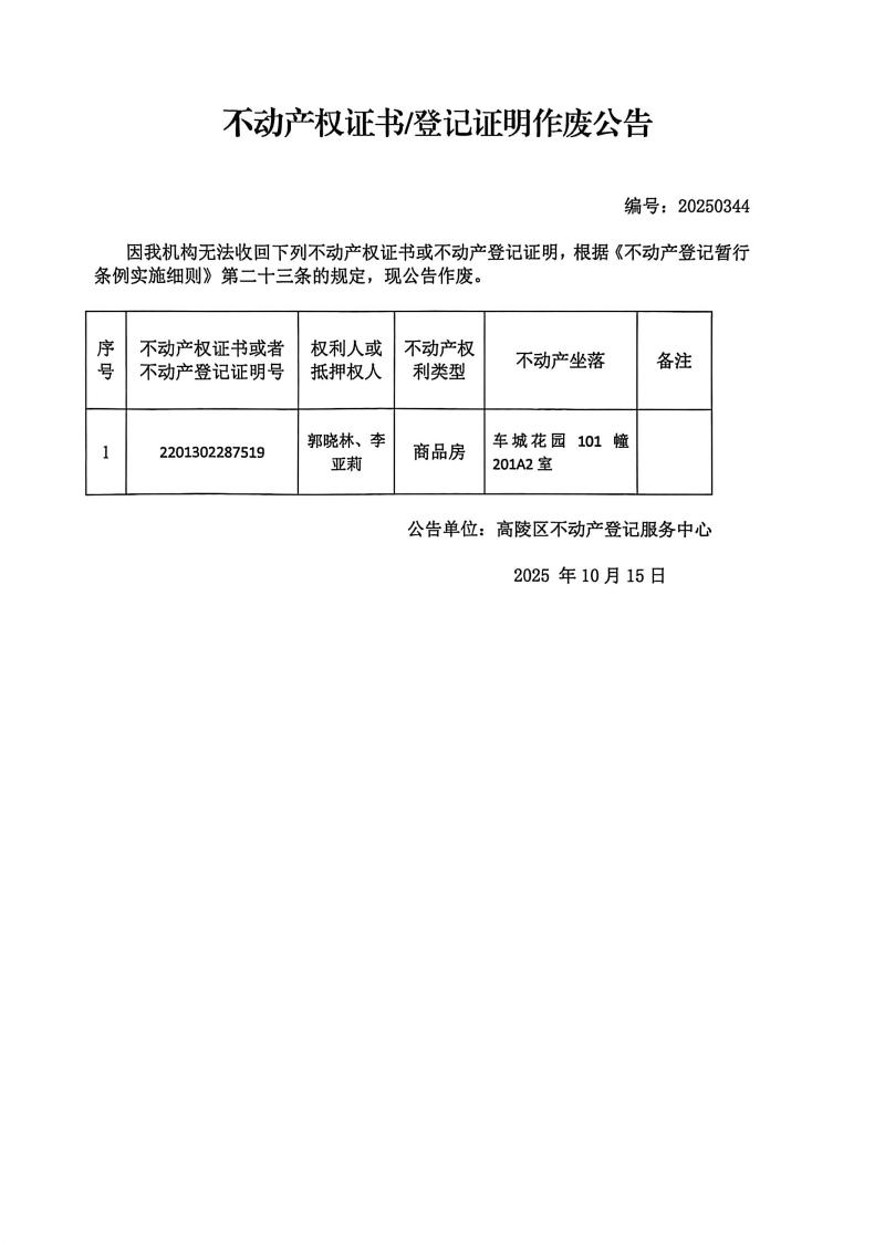 郭曉林、李亞莉不動產(chǎn)權(quán)證書/登記證明作廢公告,編號:20250344