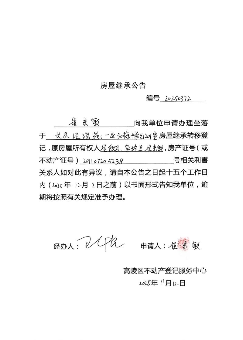 崔東敏房屋繼承公告,編號(hào):20250372
