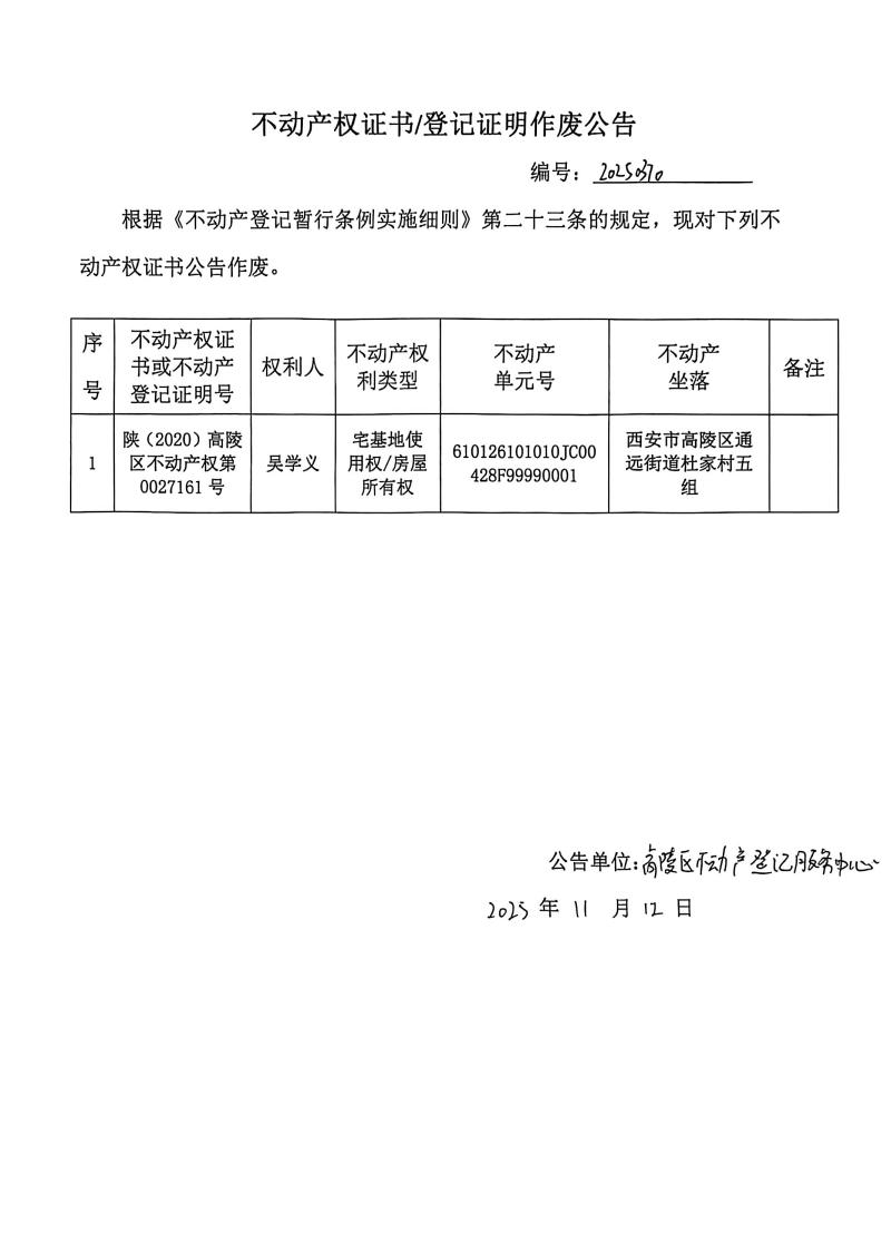 吳學義不動產權證書/登記證明作廢公告,編號:20250370