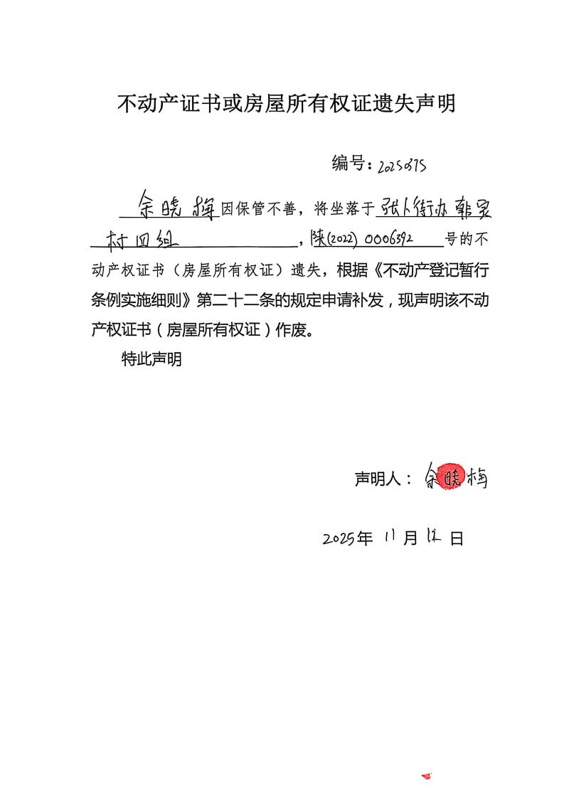 余曉梅不動產(chǎn)證書或房屋所有權(quán)證遺失聲明,編號:20250375