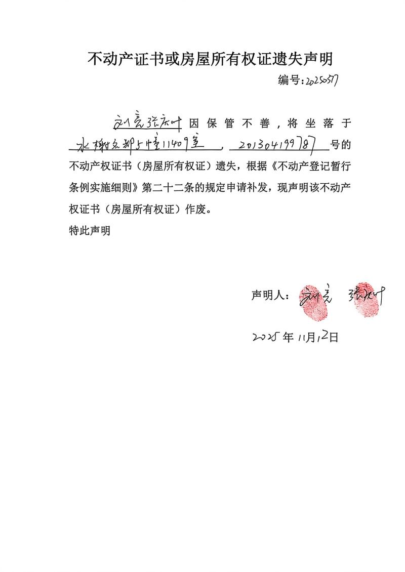 劉亮、張慶葉不動(dòng)產(chǎn)證書(shū)或房屋所有權(quán)證遺失聲明,編號(hào):20250377