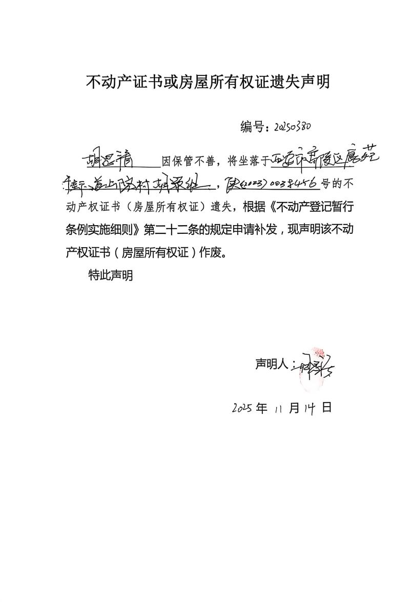 胡思清不動產證書或房屋所有權證遺失聲明,編號:20250380