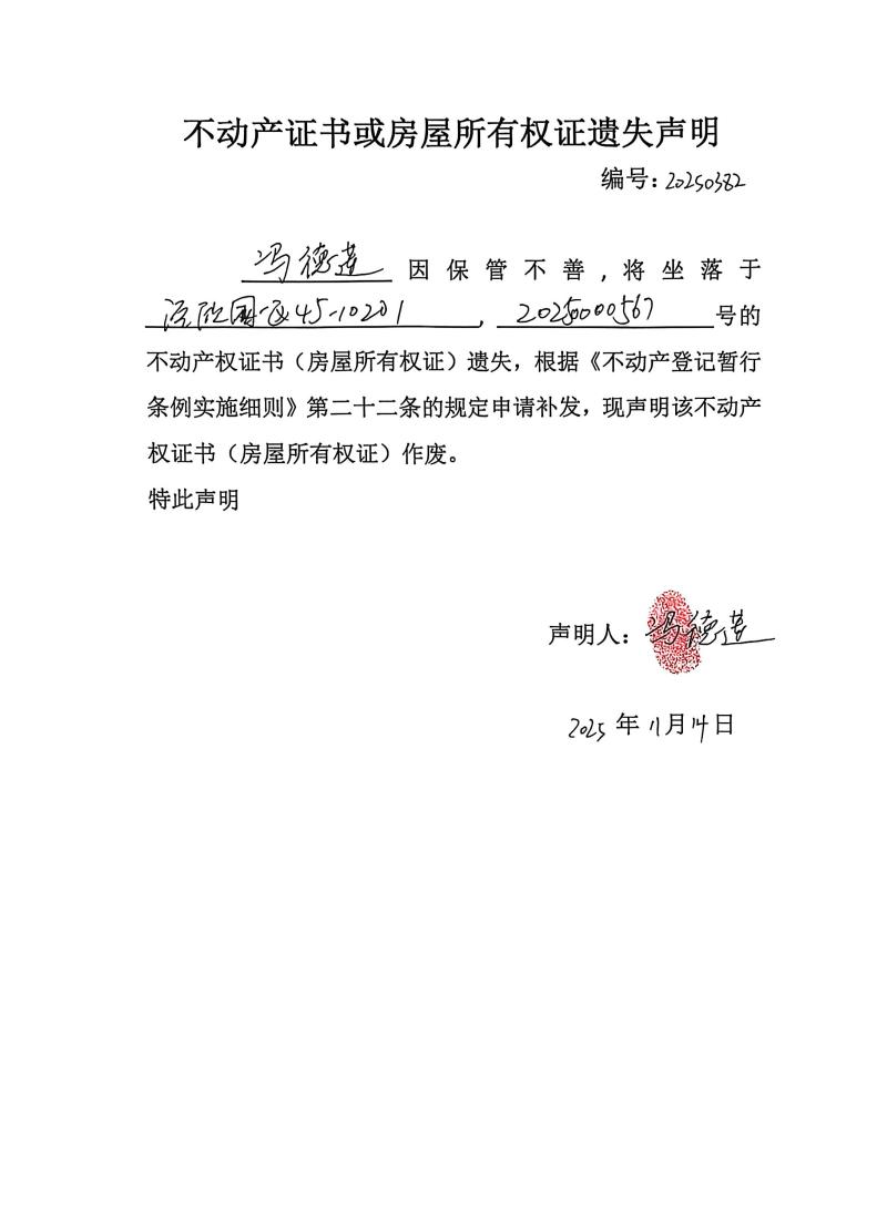 馮德蓮不動產證書或房屋所有權證遺失聲明,編號:20250382