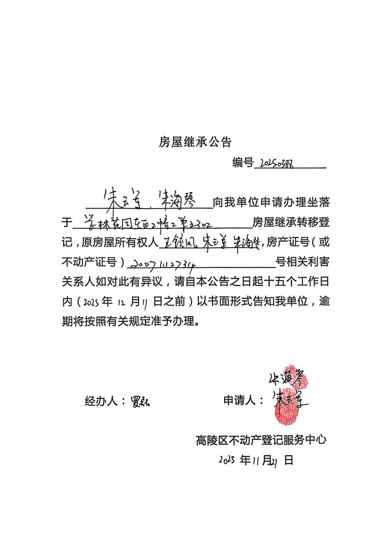朱玉軍、朱海琴房屋繼承公告,編號:20250388