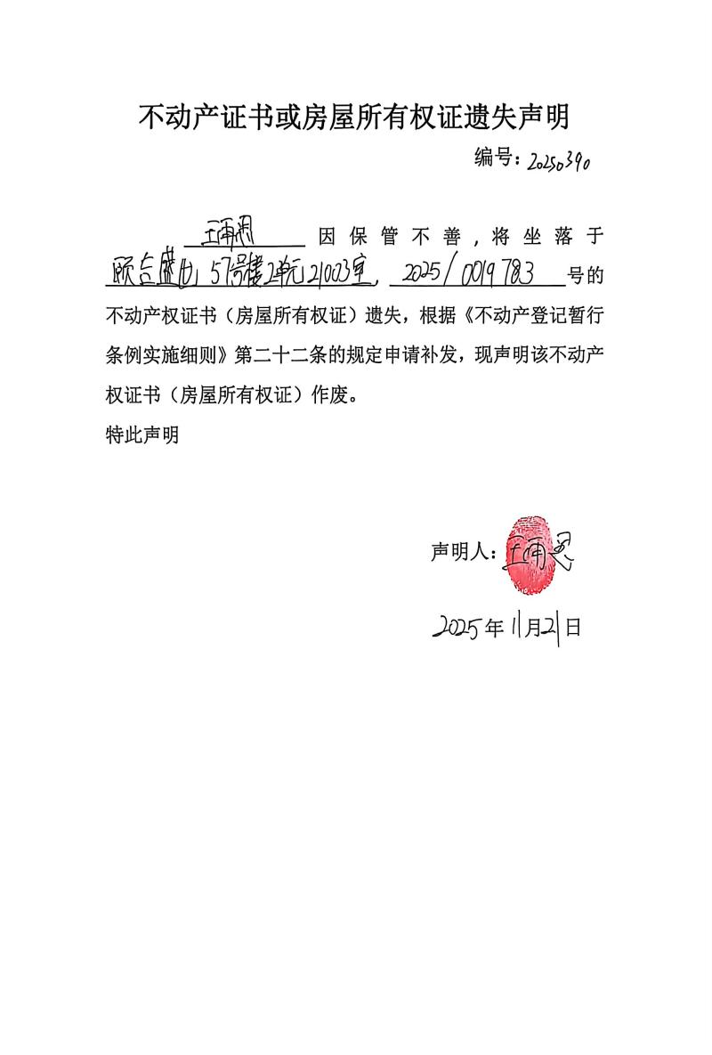 王雨思不動(dòng)產(chǎn)證書或房屋所有權(quán)證遺失聲明,編號(hào):20250390