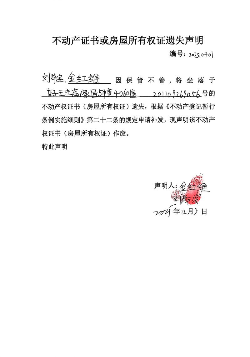 劉舉安、金紅維不動產證書或房屋所有權證遺失聲明,編號:20250401