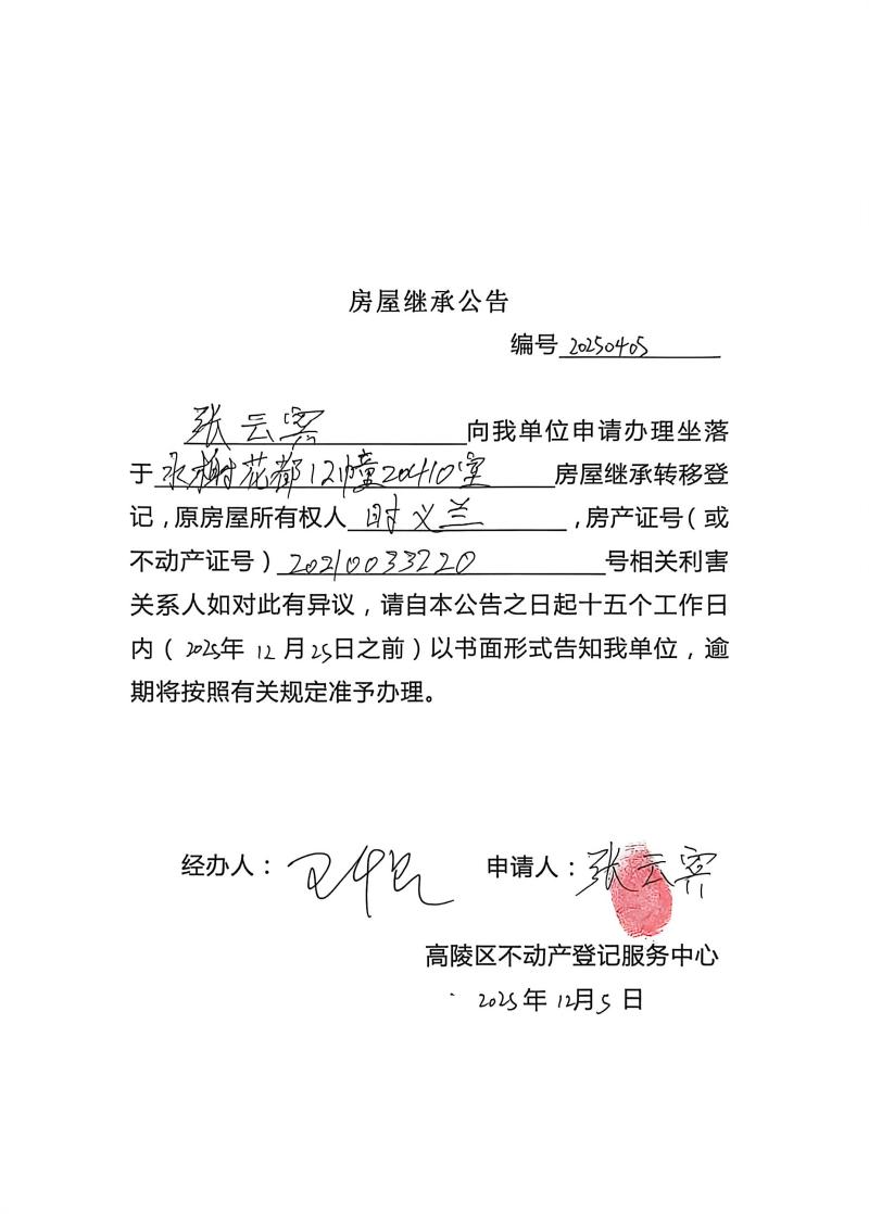 張云賓房屋繼承公告,編號:20250405
