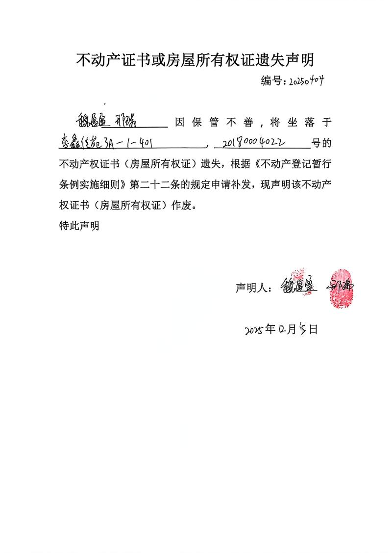 偉盈盈、邢瑞不動產(chǎn)證書或房屋所有權證遺失聲明,編號:20250404