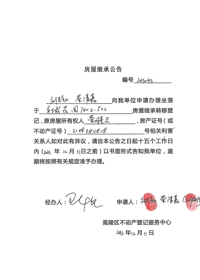 劉先知、黨清嘉房屋繼承公告,編號:20250413
